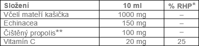 | PRODUKT OBSAHUJÍCÍ: | Včelí mateří kašička, Vitamín C, Echinacea purpunea, Propolis |